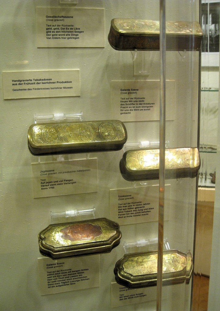 Ortswechsel. Im, seit 1666 zu Brandenburg-Preußen gehörenden Iserlohn wurden schon seit langer Zeit Gegenstände und Beschläge aus Messing gefertigt. Im Umkreis der Stadt gab es größere Erzvorkommen, unter denen sich auch Galmei (Zinkspat) fand, den man zur Herstellung von Messing benötigt. Zunächst beschäftigten sich damit nur einzelne Handwerker, 1736 gründeten wohlhabende Iserlohner Bürger dann aber die „Messinggewerkschaft“, die ab 1751 mit der hüttenmäßigen Herstellung von Messing begann. Natürlich blieb den Handwerkern auch der Erfolg der Tabaksdosen nicht verborgen. Einzelne Dosen fanden dann auch Abnehmer in den höheren Kreisen, da ihre Preise die Vorstellungskraft des normalen Bürgers deutlich überstiegen.