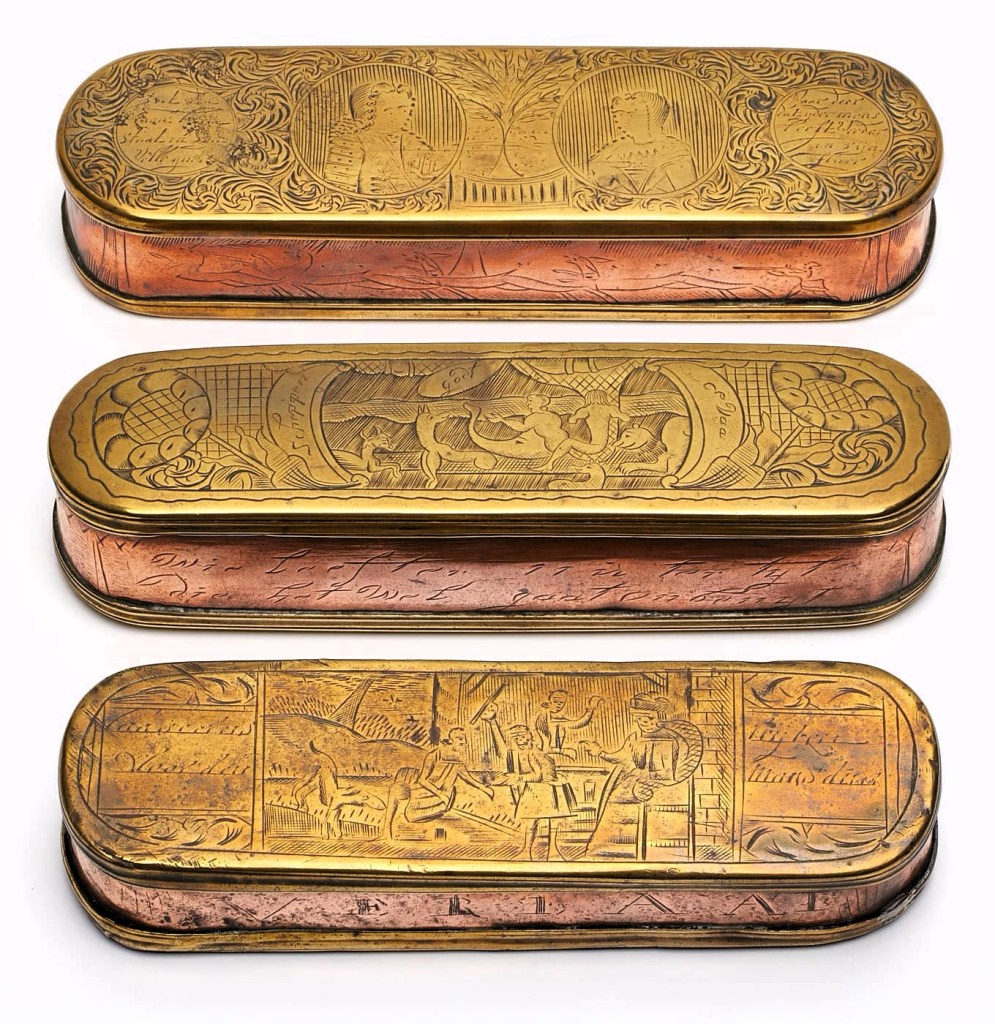 Verschiedene holländische Kunstschmiede witterten da eine Geschäftsidee. Sie fertigten Dosen aus Messing und Kupfer, rund, eckig oder oval, versahen sie in Handarbeit mit ländlichen oder biblischen Szenen und boten sie erfolgreich der solventen Kundschaft an. Es gab sogar Sonderformen, die es erlaubten, zusätzlich zum Tabak noch eine kleine Tonpfeife geschützt unterzubringen. Die einfacheren Ausführungen dieser Dosen waren vor allem auch bei den Seeleuten sehr gefragt.