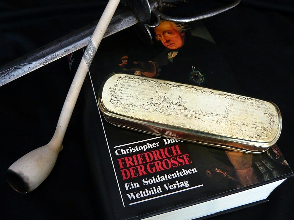 So unterstütze er Giese und seine Kollegen gern. Diese waren nämlich glühende Verehrer seiner Regentschaft und setzten ihm in vielen Prägemotiven auf ihren Dosen ein Denkmal. Ja, es gab auch Landschaften oder Dosen mit Städtemotiven, die Mehrzahl aber zeigte Friedrich den Großen bei seinen größten Triumphen. Da die Tabakdosen immer erschwinglicher wurden, fanden sie natürlich auch den Weg ins „gemeine Volk“ und rühmten so in breiten Kreisen Friedrichs Heldentaten. Irgendwie war Friedrich der Große wohl auch der erste PR-Spezialist!
